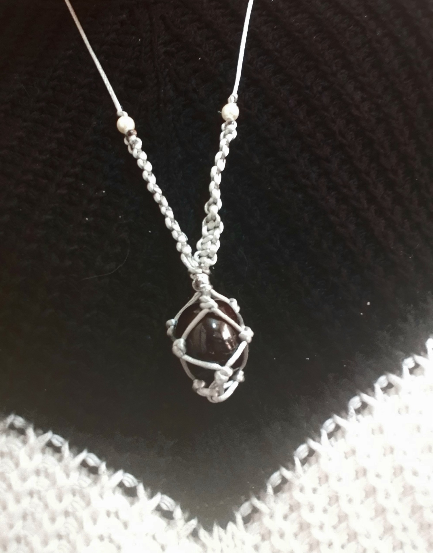 collana regolabile in macrame con granato naturale per aiutar3 la circolazione sanguigna e infondere protezione. Con questo metodo, la pietra tocca sempre la pelle elargendo le sue proprietà.